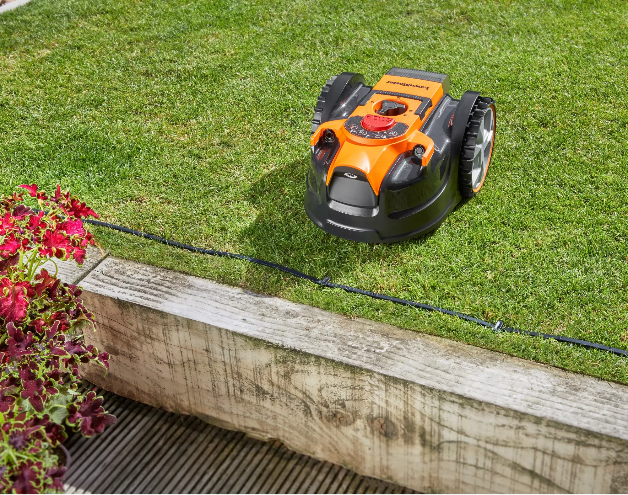 Der Mäher stoppt etwa 10 bis 20 cm vor dem Rasenrand, sodass ein Teil des Grases ungeschnitten bleibt. Dies lässt sich leicht mit einem Rasentrimmer beheben, beispielsweise mit unserem akkukompatiblen Rasentrimmer LawnMaster 24V. Die Rasenkanten sollten sauber geschnitten sein, damit der VBRM16 Plus OcuMow® die Rasenkante gut erkennen kann.