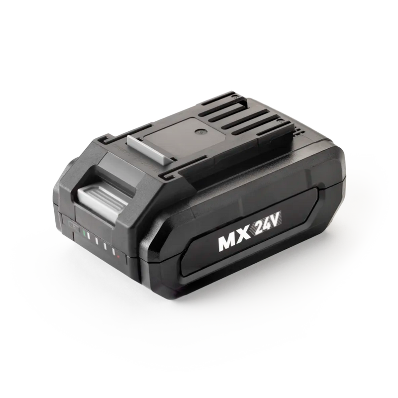 Potente batería de 2,0 Ah compatible con el sistema de batería compartida LawnMaster® MX de 24 V y con los productos de batería portátil inalámbrica para exteriores de 24 V de la marca LawnMaster . El indicador de potencia muestra la carga restante de la batería. Así nunca se quedará sin energía para trabajar en el jardín. Adecuado para utilizar con el cortacésped (CLGT2425S), el cortasetos (CLHT2452D) y el soplador de jardín (CLBL2406).