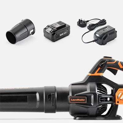 Este soplador de hojas axial funciona con una batería MX de 24 V y 4,0 Ah (se vende por separado), que ofrece hasta 240 minutos de autonomía a baja velocidad o hasta 11 minutos en modo Turbo. Una alternativa más limpia y ecológica a los sopladores de hojas de gasolina.