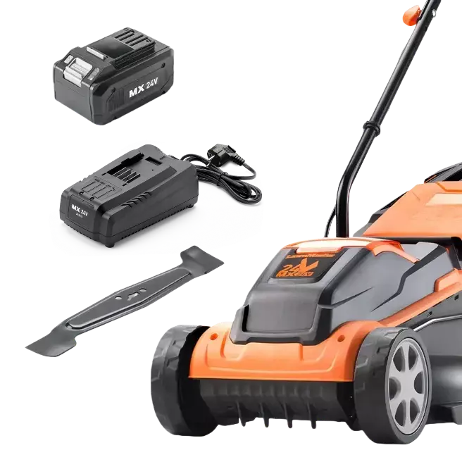 Fourni avec une batterie MX 24 V 4,0 Ah fiable et un chargeur rapide 1 heure. Toutes les batteries MX 24 V 4,0 Ah et tous les chargeurs sont entièrement compatibles avec la gamme sans fil LawnMaster 24 V, qui comprend des tondeuses à gazon, des taille-haies, des coupe-bordures, des tronçonneuses et des souffleurs de feuilles.
