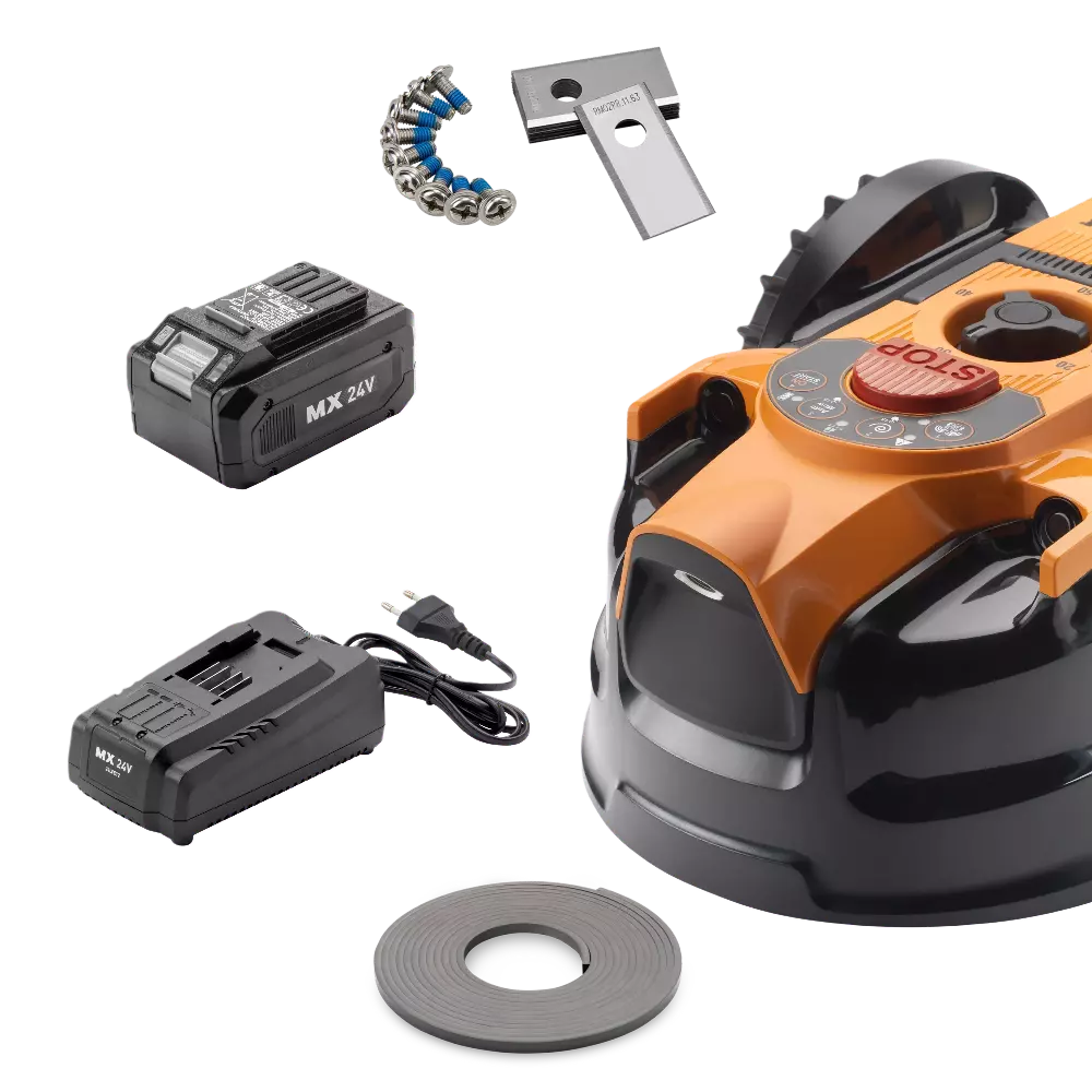 1x MX 24V 4,0Ah batteri, MX 24V snabbladdare, 6x robotgräsklipparblad, 1x No Go-kabel (5 m)